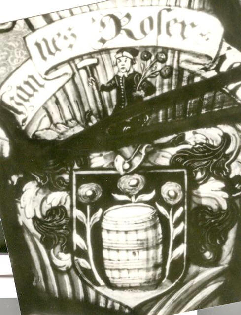Das Stifterwappen ist umgeben von einem Kranz von Namen samt Wappen von Würdenträgern der Küferzunft. Über dem o.g. Wappen steht der Name Johannes Roser 1674. Er ist unser Ahnherr der 4. Generation und lebte von 1625-1716 (Stb 1926 S.7). Als Küfermeister hatte er in seiner Zunft wichtige Funktionen: als Stückschauer übte er Qualitätskontrolle aus und gab auf die begutachteten Fässer nach Prüfung des Inhalts den Beschauvermerk; als Rechenmeister war er verantwortlich für die Zunftlade, die das Zunftvermögen enthielt und als Sozialkasse diente; als Spottschöffe wirkte er vermutlich beim Aufnahmeritual der Gesellen in die Zunft mit. Verheiratet war er mit Martha Mößner, die 10 Kinder gebar.
